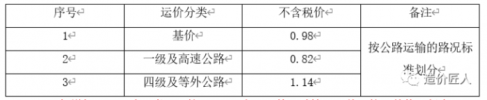 注:如增加運距影響因素,可按20km以內(nèi)和以外兩種情況調(diào)整,按照基價進行上浮和下浮,浮動幅度參考0.1元/公里.噸。