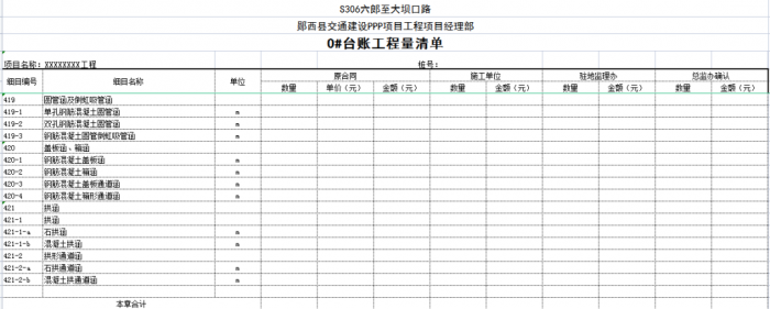 “0#”臺(tái)賬按單位、分部、分項(xiàng)工程劃分標(biāo)準(zhǔn)編制,可以將計(jì)量支付與質(zhì)量檢驗(yàn)評(píng)定有機(jī)結(jié)合起來,這樣可以使質(zhì)檢、測(cè)量、實(shí)驗(yàn)、計(jì)量等部門的內(nèi)業(yè)工作都在同一個(gè)規(guī)則下進(jìn)行,提高了整個(gè)項(xiàng)目(合同段)內(nèi)業(yè)管理的效率。